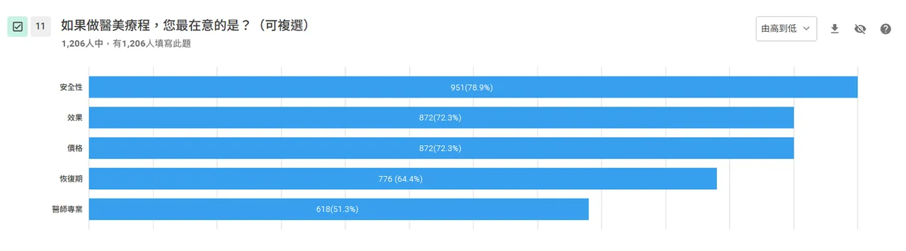 對於療程的考量,民眾在意的前三名分別為「安全性」(78%)、「效果」(72.3%)與「價格」(72.3%) 。此外,有超過半數(51.3%)的民眾認為「醫師專業」是重要關鍵 。