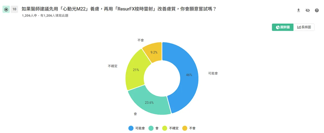 張姵妮醫師建議「先養膚、再喚膚」,即先用心動光穩定膚況,再用梭時雷射改善膚質時,有69.6%的民眾表達了嘗試意願 。