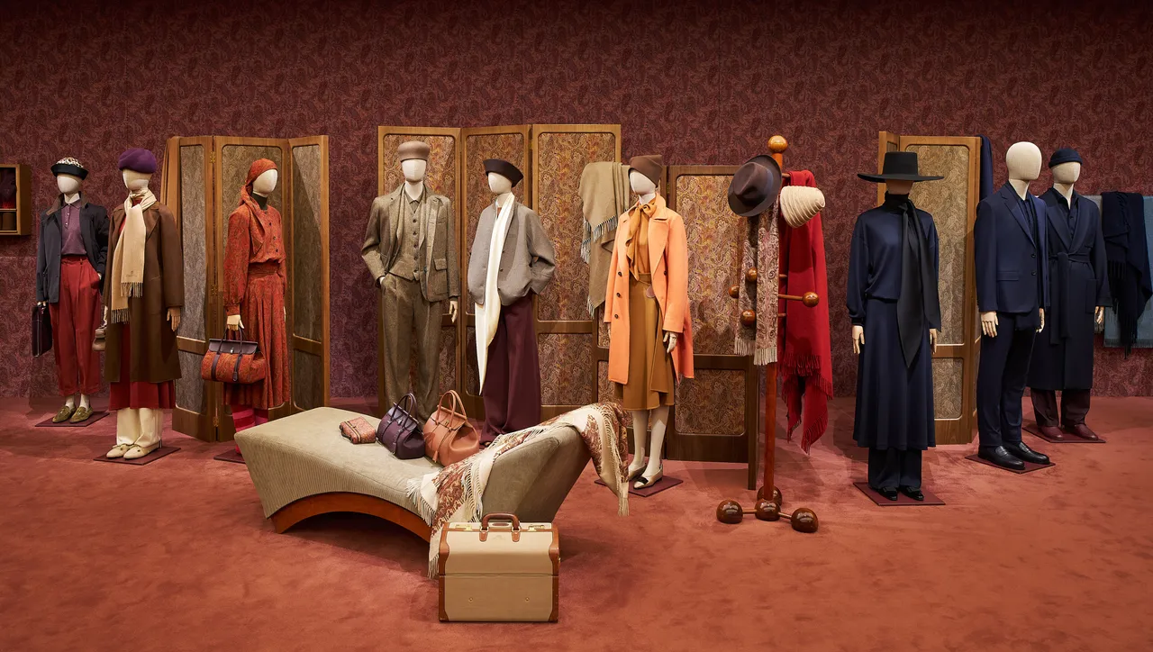 本季最迷人的主角莫過於充滿神祕色彩的腰果花紋(Paisley),這款誕生於兩千多年前的經典水滴圖騰,自18世紀傳入歐洲後,便深深吸引著Loro Piana。品牌從位於Varallo的歷史檔案館中汲取靈感,將60至70年代的特色圖案重新演繹。細緻複雜的花紋跳脫了傳統框架,以深邃的大地色系與亮眼的南瓜橙黃色交織,從牆面屏風延伸至精細的網版印製披肩,處處展現工匠對於色彩層次與面料手感的極致堅持。