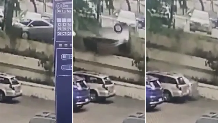 現場監視器畫面顯示,一輛轎車突然衝出路面,女駕駛似乎打算緊急將車輛拉回,但沒能成功,轎車撞破護欄,翻滾撞擊2次後,掉到與路面相差約5公尺的停車場裡。而且轎車墜落位置正好是停車場剩下的唯一空位,不過當場空位旁的車輛也受到撞擊。